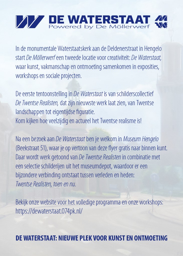 Samen met hun collega’s laten zij zien hoe veelzijdig en actueel het Twentse realisme vandaag is. Tegelijkertijd is in Museum Hengelo een kleinere presentatie te zien waarin hedendaags realisme wordt gecombineerd met schilderijen uit het depot – een blik op verleden en heden. Bezoekers van de tentoonstelling in De Waterstaat krijgen gratis toegang tot de presentatie in Museum Hengelo.